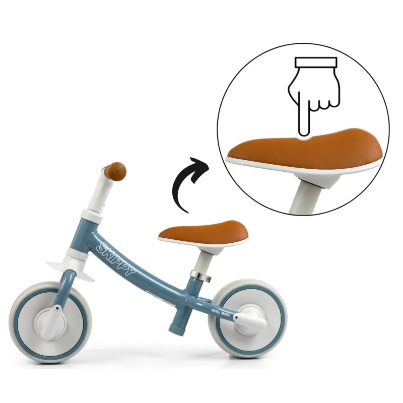 Milly Mally Skippy balansinio dviratuko ergonomiška forma suteikia neprilygstamą komfortą važiuojant ir taisiklingą vaiko laikyseną. Tinka vaikams nuo 18 mėnesių.
