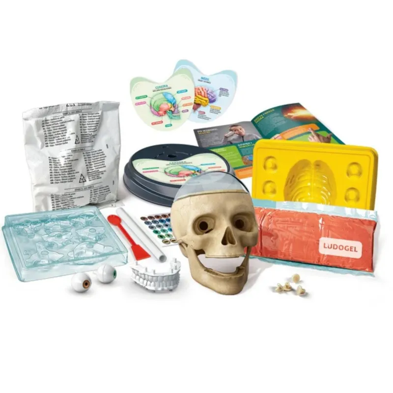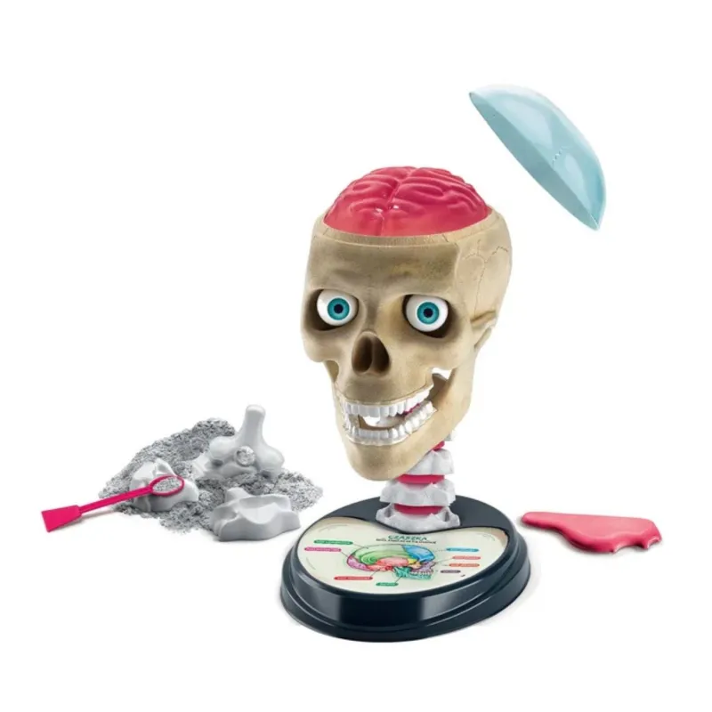 Žmogaus kaukolės modelis su įvairiais surinkimo komponentais: želatinos pavidalo smegenimis, besisukančiomis akimis, plastikiniais dantimis ir gipsiniais slanksteliais!