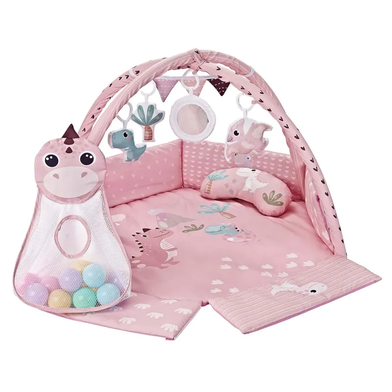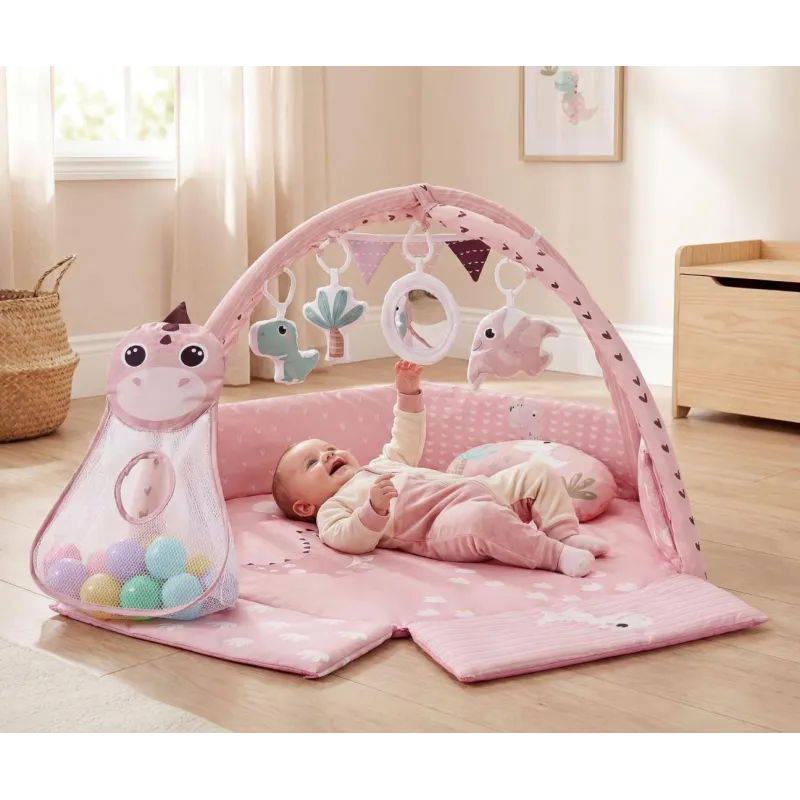 TinyMini Dino Pink žaidimų kilimėlis yra interaktyvus žaidimų kilimėlis kūdikiams, skirtas saugiam žaidimui ir harmoningam vystymuisi nuo pirmųjų gyvenimo savaičių. Jo pastelinės spalvos ir žavus dinozaurų motyvas džiugina tiek vaikus, tiek tėvus.