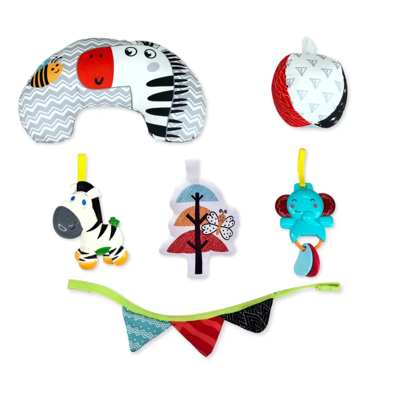 4 žaislai (dramblys, zebras, medis, kamuolys);