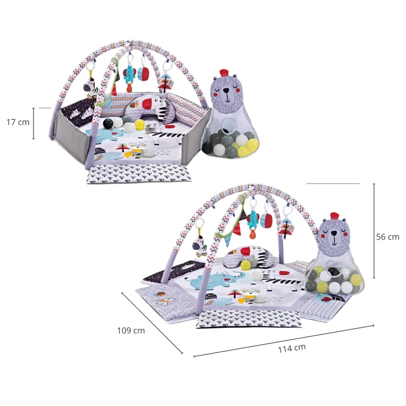 TinyMini miegančio meškiuko žaidimų kilimėlis yra jaukus ir funkcionalus žaidimų kilimėlis kūdikiams, skirtas saugiam žaidimui ir kūdikio vystymuisi nuo pirmųjų gyvenimo savaičių. Subtilios spalvos ir gyvūnų motyvai skatina ramybę, susikaupimą ir saugumo jausmą. Tai puikus linksmybių, komforto ir sensorinio vystymosi derinys. Šis interaktyvus žaidimų kilimėlis kūdikiams siūlo įvairias, pagal amžių tinkamas veiklas: