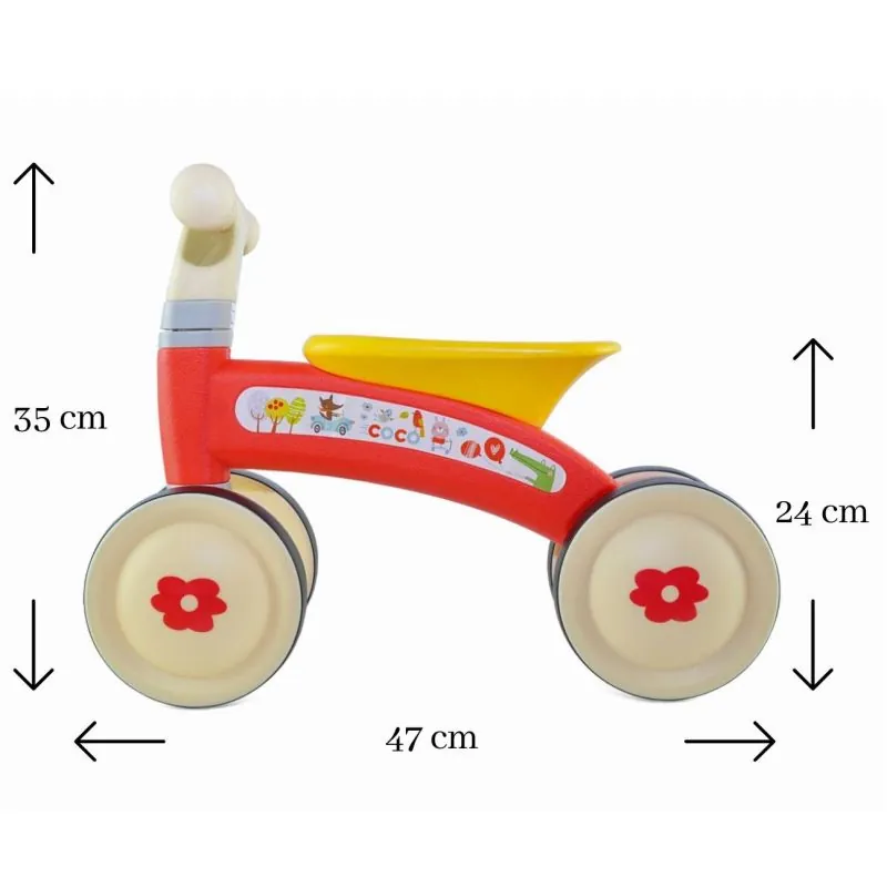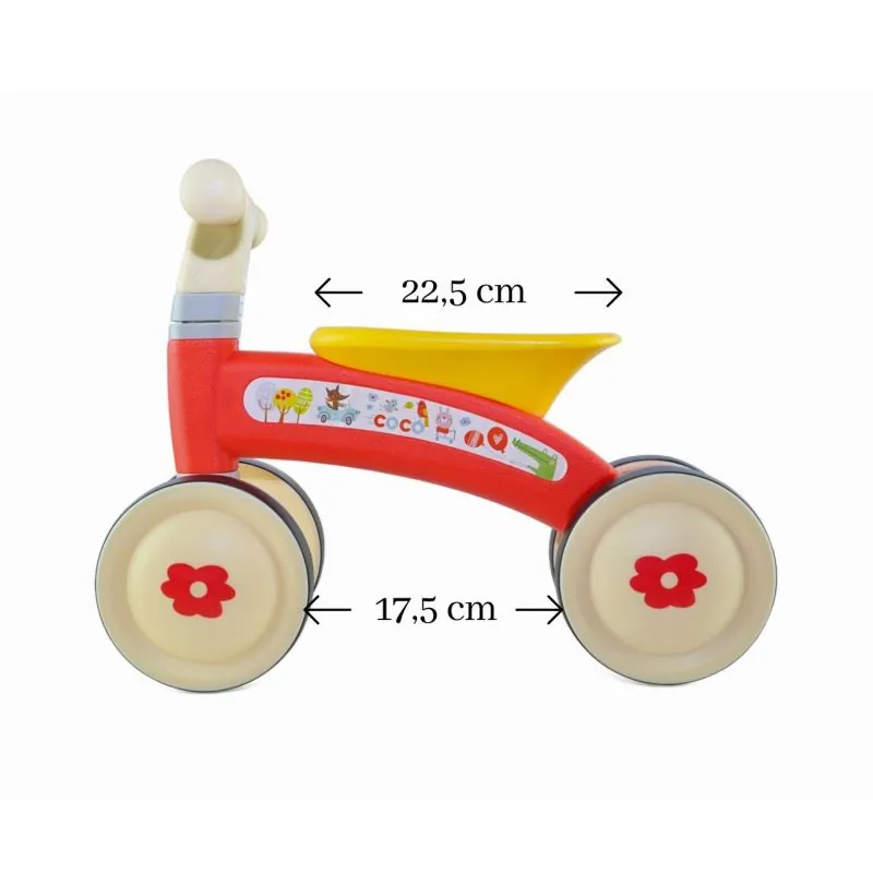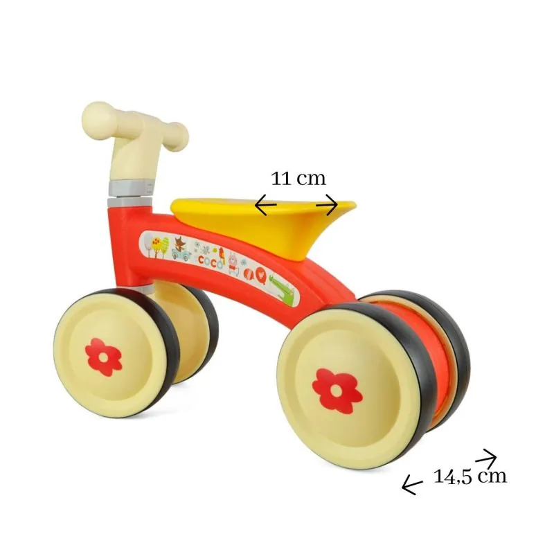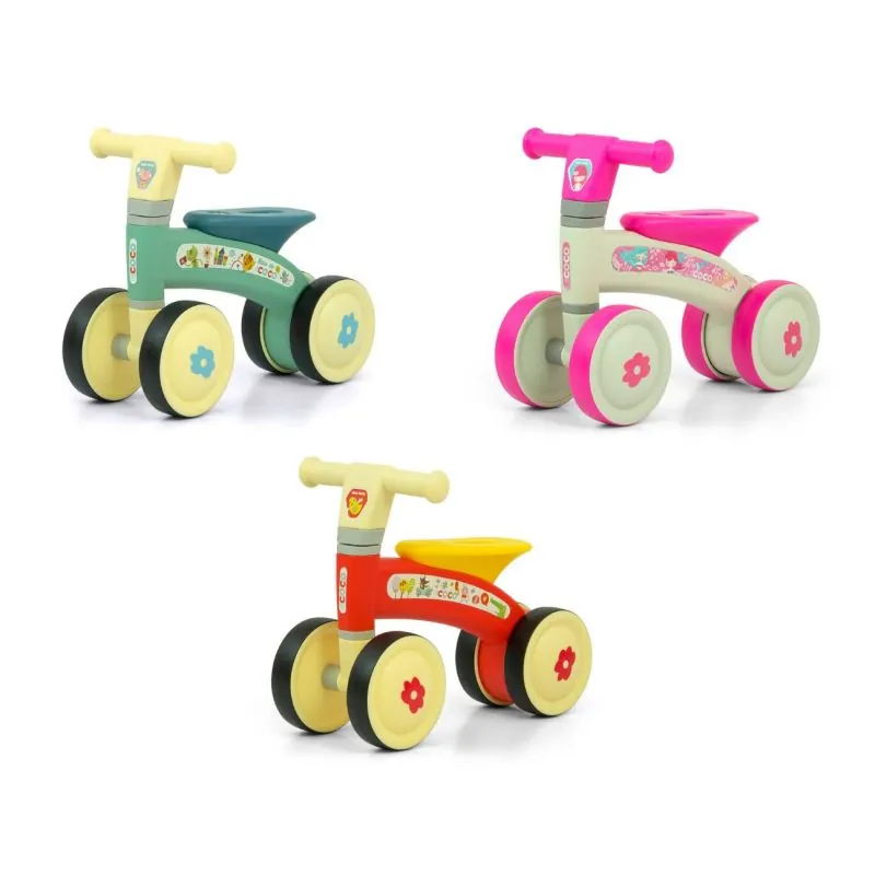 Četri riteņi nodrošina braukšanas stabilitāti, drošību un ērtumu gan mājās, gan ārā.Viegls un izturīgs dizains.Ritenītis attīsta motoriku un kāju muskuļus.Izgatavots no augstas kvalitātes cieta plastmasas.Dubultie aizmugurējie riteņi nodrošina lielāku stabilitāti un vienlaikus vieglu braukšanu.Ērti rokturi.Ērts sēdeklis.Neparasts COCO dizains bērnam braukt ar to no 12 mēnešiem.COCO ritenītis ir viegls un viegli transportējams.Klusie riteņi ar gumijas pārklājumu, 14,5 cm diametrā.Ātra un ērta montāža.Maksimālais svars 20 kg.