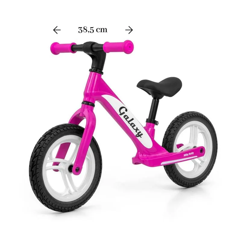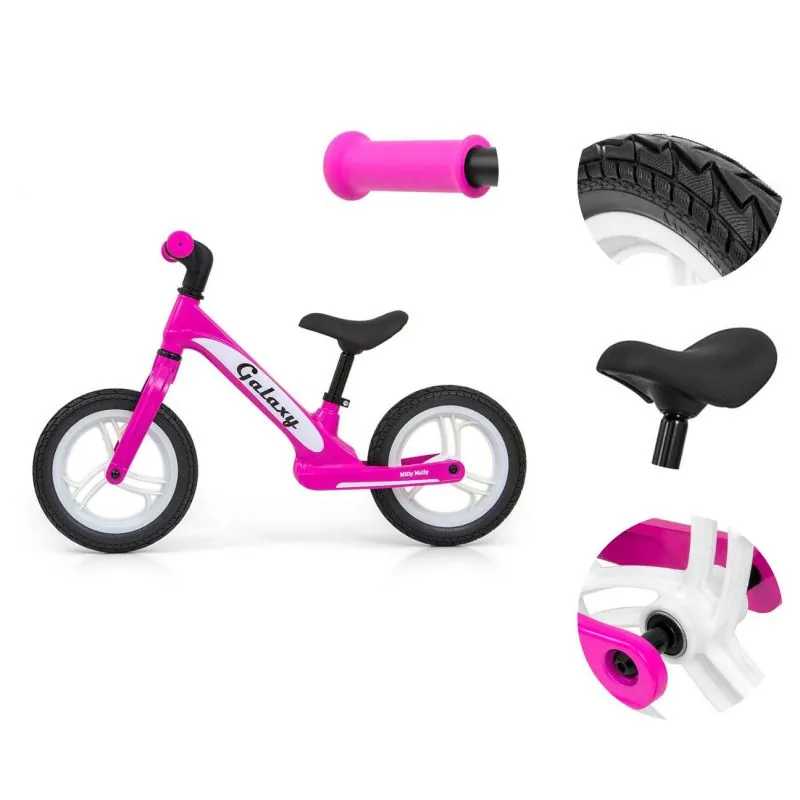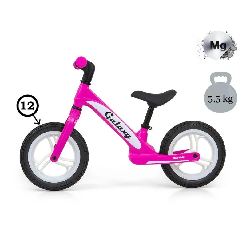 Izgatavoti no izturīga un jaunākās EVA putu tehnoloģijas, 12 collu riteņi, kuriem nav nepieciešama pumpēšana, tāpēc tiem nav nepieciešama apkope. Ergonomisks sēdeklis ar mīkstu pildījumu un augstuma regulēšanas iespēju liek velosipēdam augt kopā ar bērnu. Galaxy ir bumbiņveida torsionu stūre. Neslīdoši, mīksti gumijas rokturi nodrošina uzticamu saķeri un ērtu vadību. Šis līdzsvara velosipēds ir izgatavots, izmantojot bezmetināšanas tehnoloģiju.Īpaši vieglais magnija velosipēda rāmis nodrošina lielāku izturību pret pārslodzēm. Velosipēds ir piemērots ilgstošai lietošanai pašiem mazākajiem un ērti pārnēsājams, pateicoties mazajam svaram.Magnija īpašības ir vieglāk formējamas, salīdzinot ar, piemēram, tēraudu vai alumīniju.