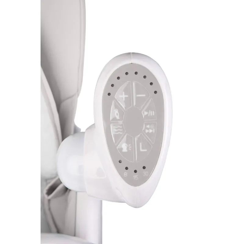 Izmērs: 60x90x103 cm;Sēdekļa izmērs: 33x22 cm;Atzveltnes izmērs: 33x47 cm;Izmērs salocītā veidā: 58x60x110 cm;5 punktu drošības jostas;Regulējams atzveltnes un kāju balstu augstums, kā arī krēsla augstums;Izgatavots no mīksta PVC materiāla;Polsterējumi, melodijas;Nepieciešamas baterijas 4x1,5 V L14 (nav iekļautas) vai lietojams ar lādētāju (iekļauts);Svars: 14,1 kg;Regulējams šūpošanās ātrums un iespēja šūpot noteiktu laiku;Alumīnija rāmis;Noņemams paplāte.