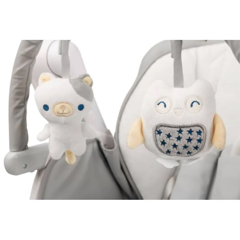 Izmērs: 60x90x103 cm;Sēdekļa izmērs: 33x22 cm;Atzveltnes izmērs: 33x47 cm;Izmērs salocītā veidā: 58x60x110 cm;5 punktu drošības jostas;Regulējams atzveltnes un kāju balstu augstums, kā arī krēsla augstums;Izgatavots no mīksta PVC materiāla;Polsterējumi, melodijas;Nepieciešamas baterijas 4x1,5 V L14 (nav iekļautas) vai izmantojams ar lādētāju (iekļauts);Svars: 14,1 kg;Regulējams šūpošanās ātrums un iespēja šūpot noteiktu laiku;Alumīnija rāmis;Noņemams paplāte.
