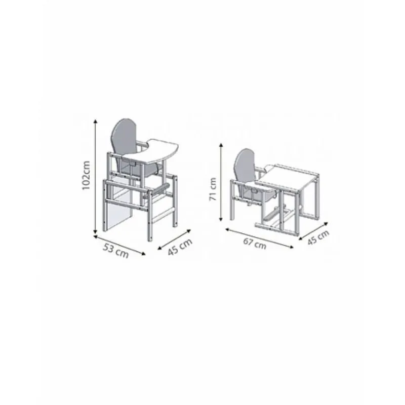 Barošanas krēsliņš izgatavots no priedes masīvkoka;Koka krēsliņš, bērnam augot, pārvēršas par galdiņu ar krēsliņu;Galda virsmu var noņemt, atskrūvējot skrūves, jūs varat būt pārliecināti, ka bērns neizstumj galda virsmu un neizkrīt no krēsliņa;Atverama drošības josta starp kājām;Pārvalks viegli tīrāms;Krēsliņš paredzēts lietošanai bērnam līdz 15 kg.;