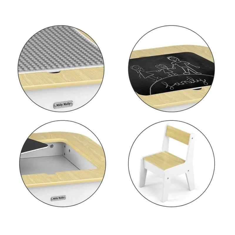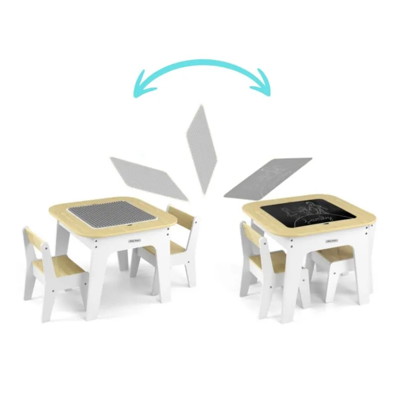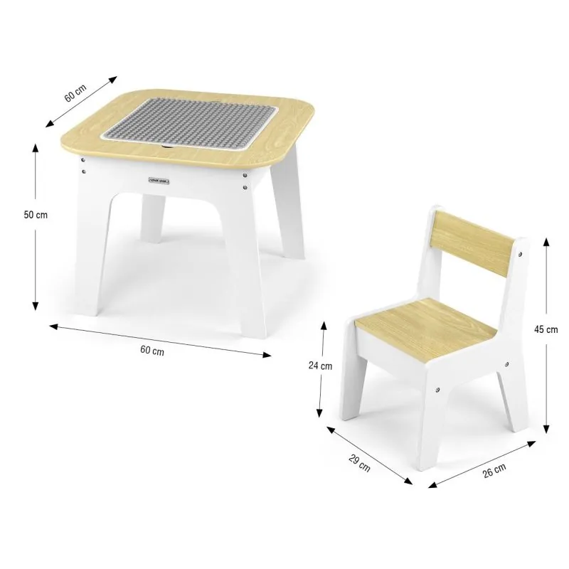 "Olaf Blocks" bērnu mēbeļu komplekts – galds un divi krēsli – ir daudzfunkcionāls komplekts, kas izstrādāts, lai nodrošinātu komfortu un vietu radošām spēlēm un mācībām pašiem mazākajiem.