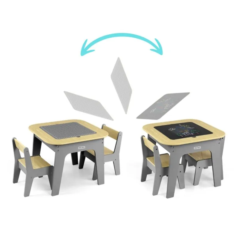 "Olaf Blocks" bērnu mēbeļu komplekts – galds un divi krēsli – ir daudzfunkcionāls komplekts, kas izstrādāts, lai nodrošinātu komfortu un vietu radošām spēlēm un mācībām pašiem mazākajiem.