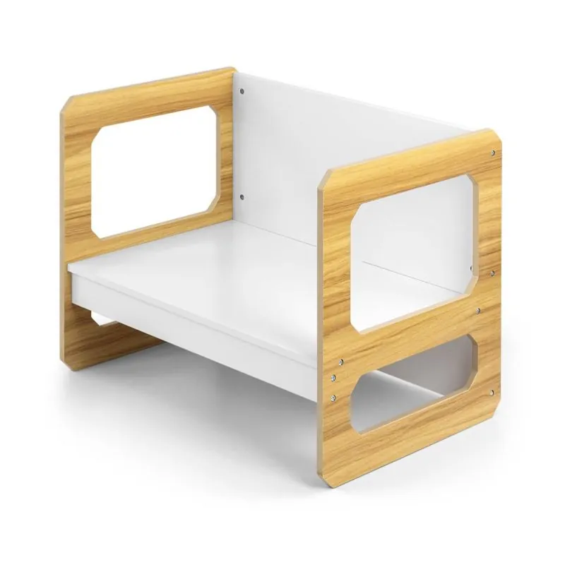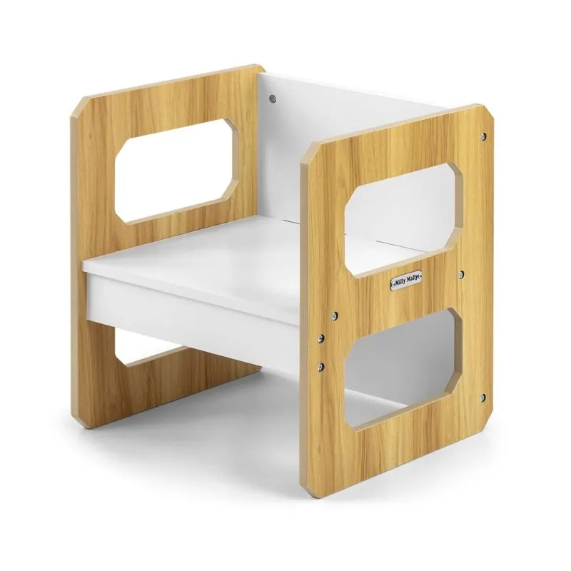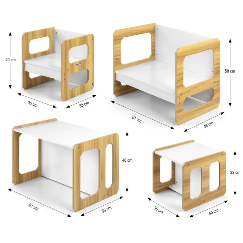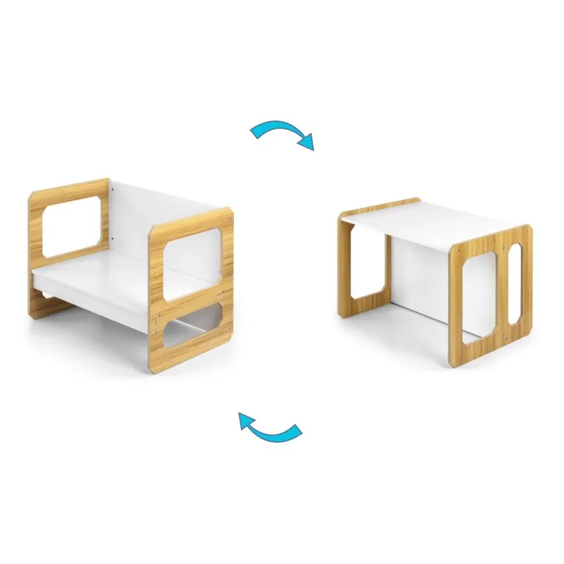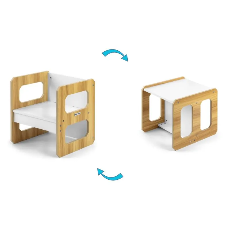 Galdu var pārveidot par lielāku krēslu, bet krēsliņš ir lieliski piemērots kā mazāks galdiņš vai krēsls bez atzveltnes vecākam bērnam;