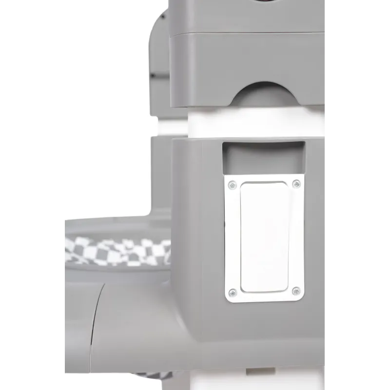 Noņemamais dubultais paliktnis ļauj viegli uzturēt tīrību ēšanas laikā, un augstuma regulēšana ļauj pielāgot krēslu pie galda;