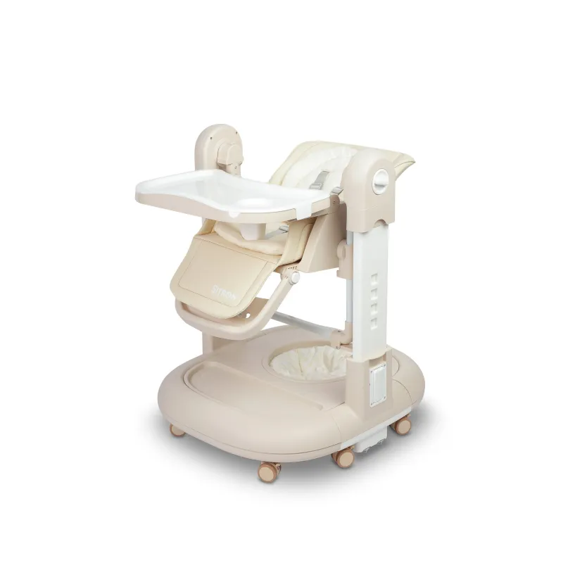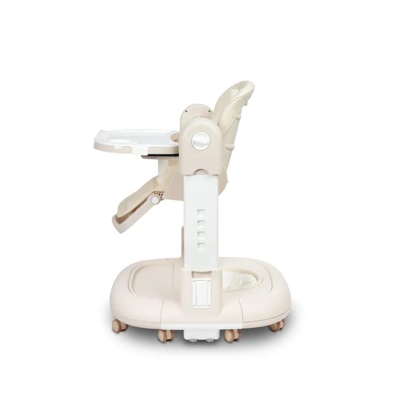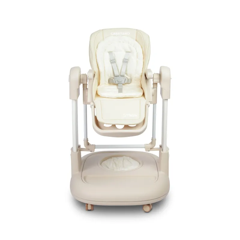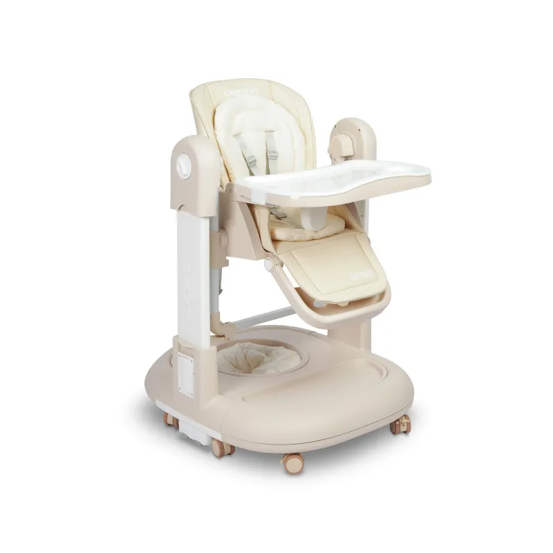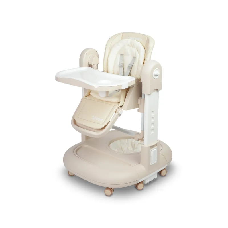 Barošanas krēsls ir aprīkots ar drošības jostām, kas droši notur jūsu mazuli sēdeklī, un bloķējamie riteņi nodrošina stabilitāti;