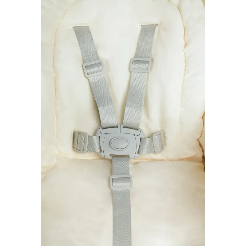 Aizsargjostas un papildu mīksts ieliktnis nodrošina stabilu mazuļa pozīciju, un viegli tīrāmais polsterējums ļauj ātri un ērti tīrīt;