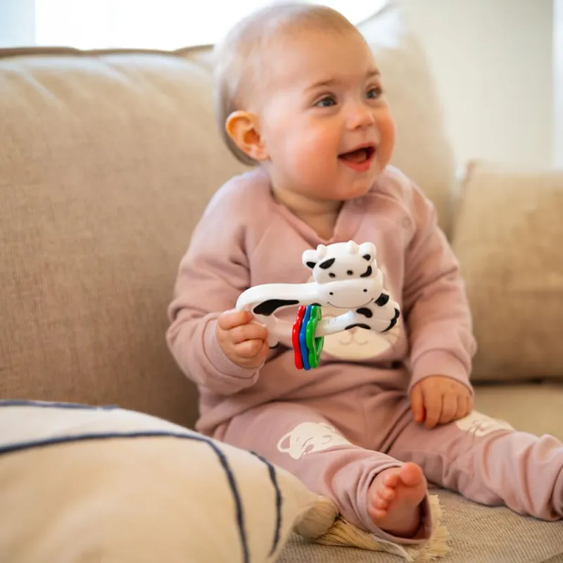 Pareizi izvēlētā grabulīša forma ļauj to ērti satvert un turēt mazās rokās. Speciālas cilnes stimulē taustes sajūtu.