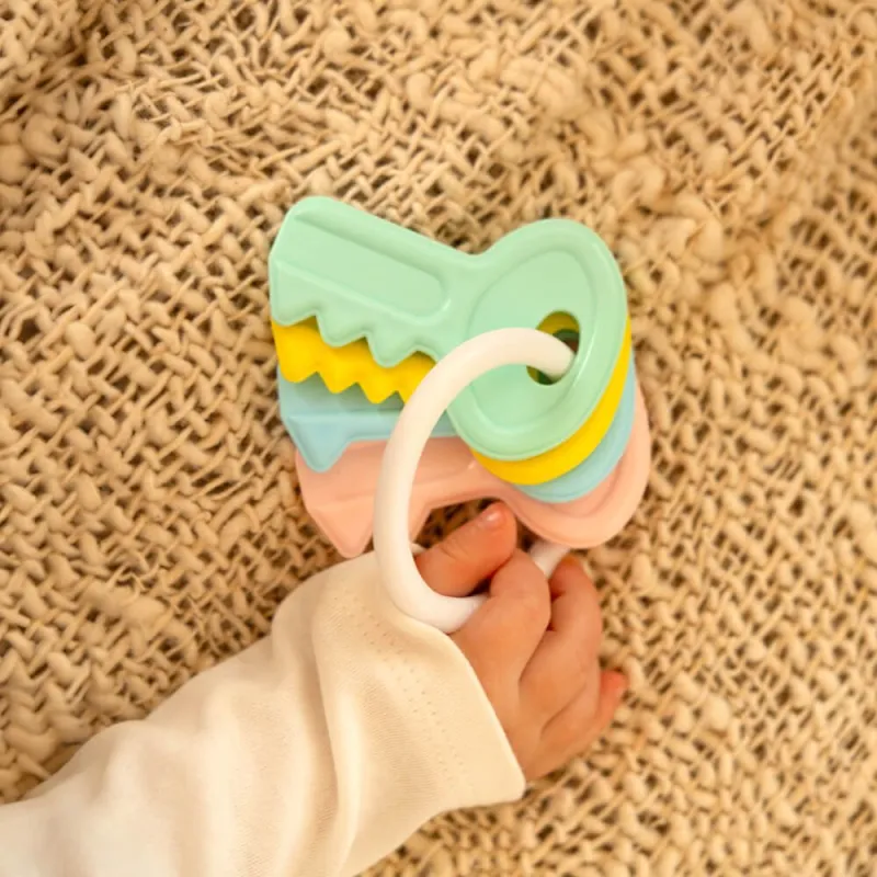 Pareizi izvēlētā grabulīša forma ļauj to ērti satvert un turēt mazās rokās. Speciālas cilnes stimulē taustes sajūtu.