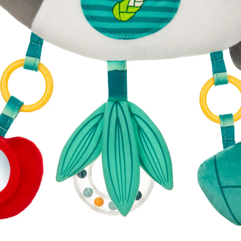 Dažādi sensoru elementi – Rotaļlietai ir ābola formas spogulis, kas veicina redzes attīstību, kā arī grabulis un satveršanas elementi, kas palīdz attīstīt smalko motoriku;