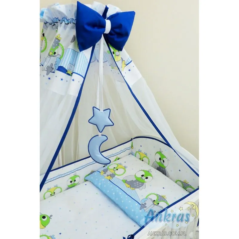 Baldahīns no tilla;Segas pārvalks 120/90 cm.;Spilvens 40/60 cm.;Segas pārvalks 120/90 cm.;Spilvena pārvalks 40/60 cm.;Gultas malas aizsargs 360 cm. (visapkārt gultas perimetram).