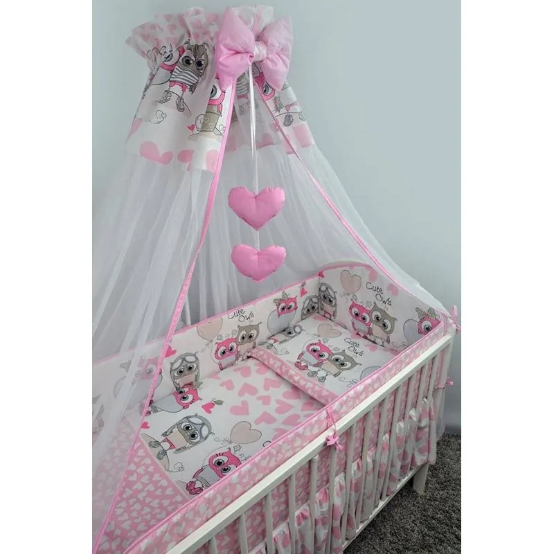 Baldahīns no tills.;Segas pārvalks 120/90 cm.;Spilvens 40/60 cm.;Segas pārvalks 120/90 cm.;Spilvena pārvalks 40/60 cm.;Gultiņas malu aizsargs 360 cm. (ap visu gultiņas perimetru).