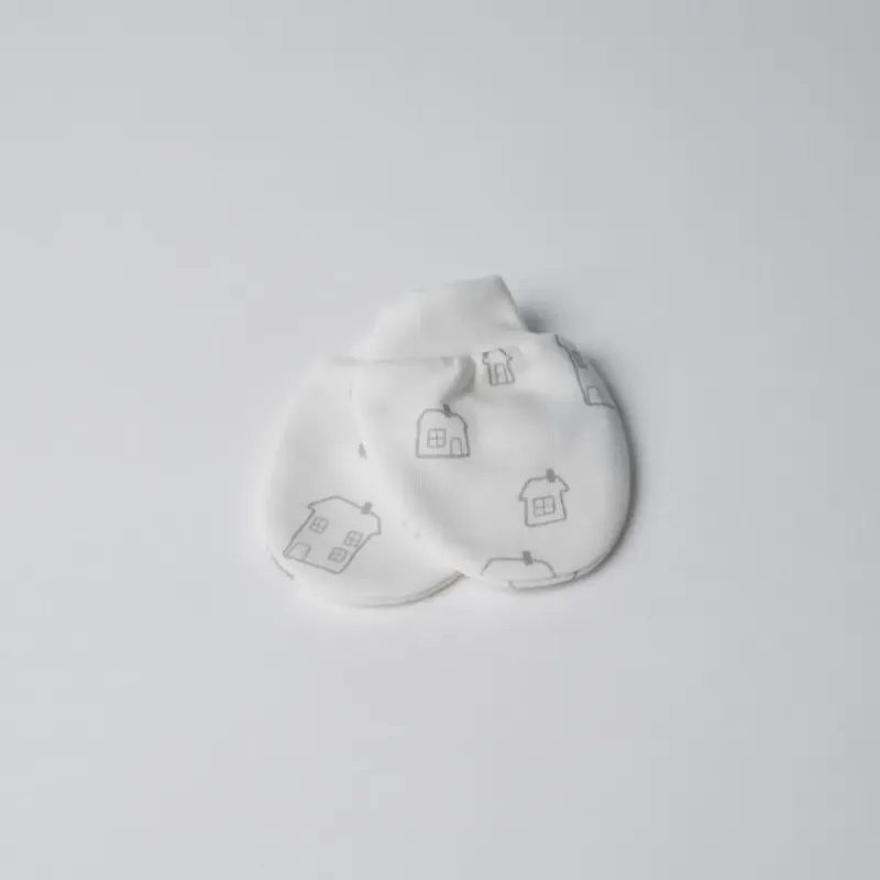 Balti krāsas siltināti kokvilnas cimdiņi ar namiņiem.