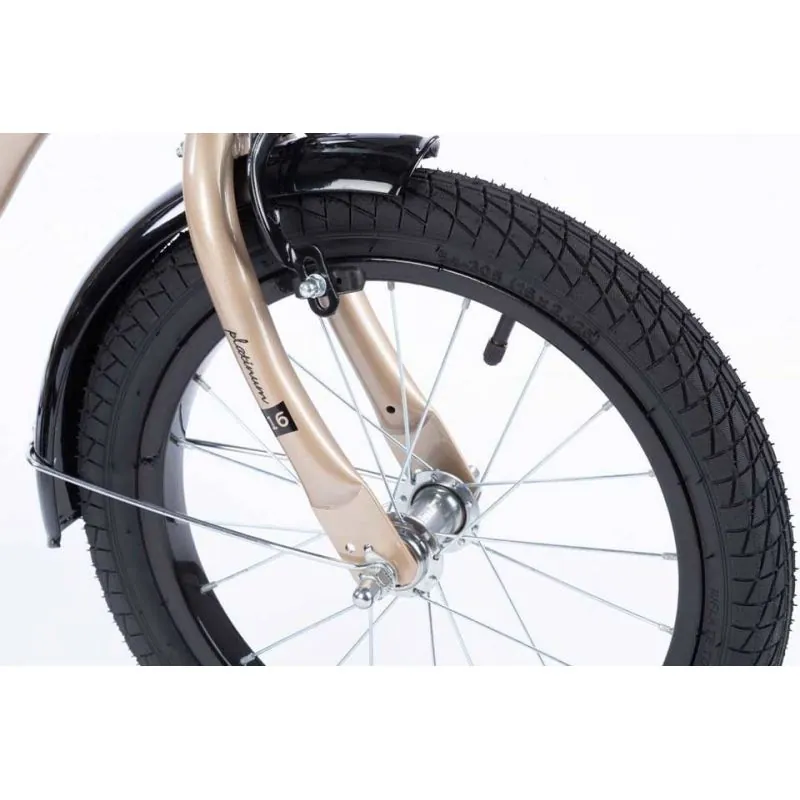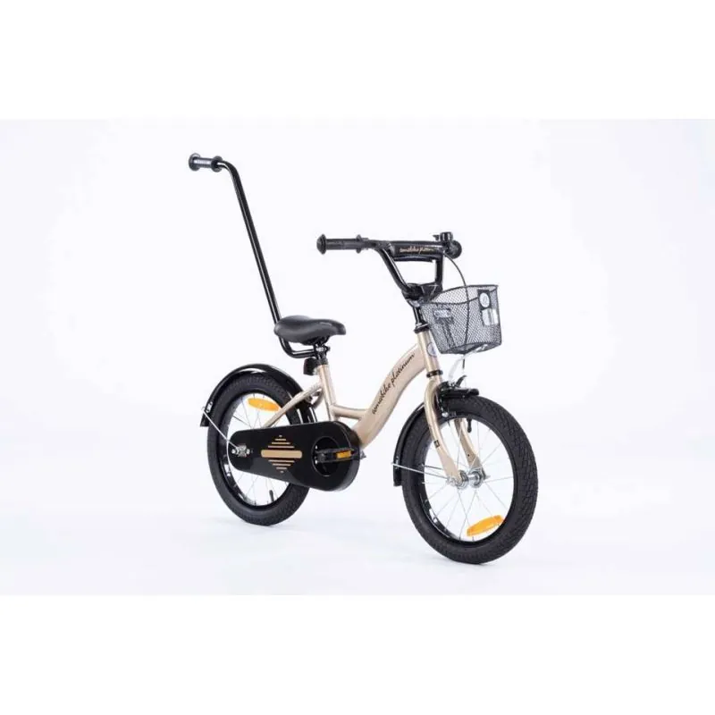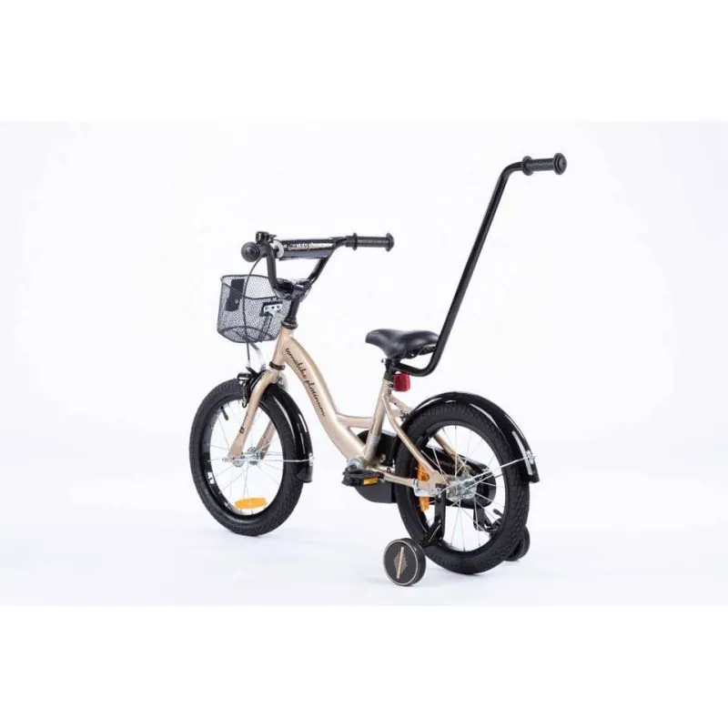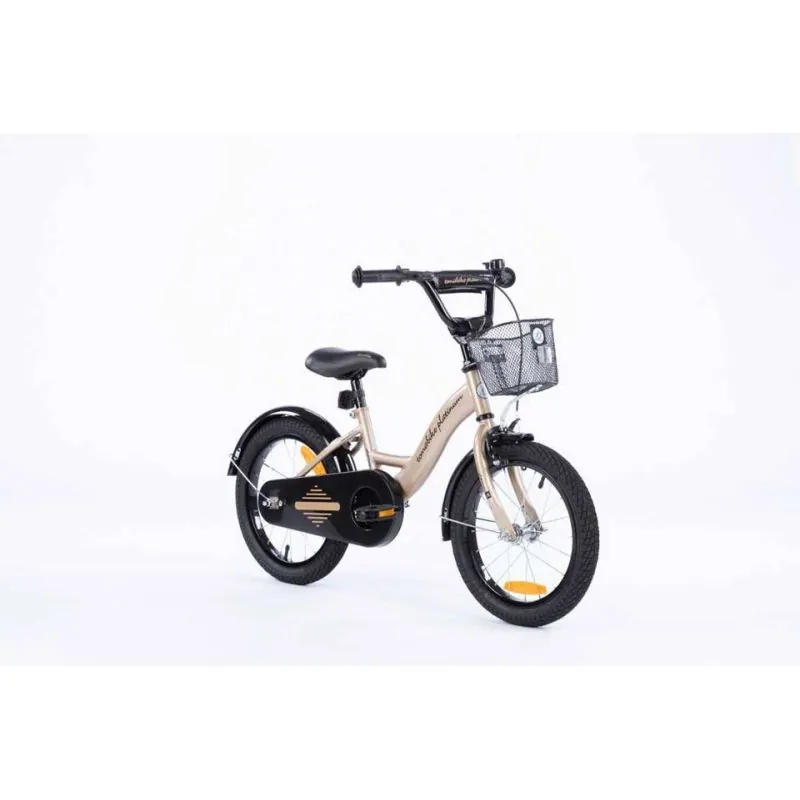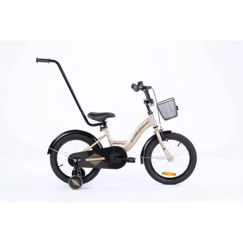 Kvalitatīvs velosipēds ar 16 collu riteņiem.Izgatavots no kvalitatīviem materiāliem, ievērojot augstākos kvalitātes un drošības standartus. Velosipēds lieliski piemērots braucieniem pilsētā un ārpus tās.Sānu riteņi ar regulēšanu - izjaucami, kad tie vairs nav nepieciešami.Plats tērauda rāmis.Neslīdoši, gumijas rokturi ar sānu aizsardzību, lai, tuvojoties sienai, nesavainotu rokas.Regulējama augstuma stūre.Tērauda aploces.Riteņu izmērs 16".Riepas ar dziļu protektoru, kas lieliski izmet grants akmentiņus.Regulējama augstuma sēdeklis.Uz stūres ir rokas bremze, kas bremzē priekšējo riteni.Aizmugurējais ritenis tiek bremzēts ar pedāļu atpakaļgaitu.Ķēde pilnībā pārklāta, lai netīrītu bērna drēbes un kājas.Uz stūres pieskrūvējams metāla groziņš.Zvans.Atstarotāji aizmugurē un uz riteņiem.