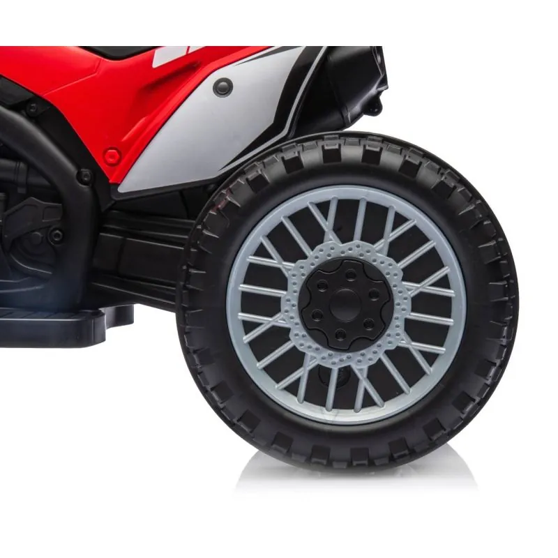 Licencēts transportlīdzeklis-Honda CRF;Trīsritenis, tāpat kā tā prototips, ir sportiska dizaina un plēsīga rakstura kombinācija;Transportlīdzeklis tika izgatavots, ņemot vērā vismazākās detaļas no augstākās kvalitātes materiāliem, kas izceļas ar lielu izturību un drošību;Nospiežot akseleratora pedāli, trīsritenis kustas;Lieli, plati riteņi ar bezceļu protektoru nodrošinās mobilitāti ceļojumos ārpus mājas;Profilēts sēdeklis – pietiekams komforts un drošība pašiem mazākajiem lietotājiem;Savukārt tērauda riteņu asis garantē trīsriteņa stabilitāti un ilgmūžību;Braucot bērns attīstīs savas roku prasmes, orientāciju kustībā, motoriku;Izstrādājuma lietošana pieaugušā uzraudzībā;Konturēts sēdeklis;Rotējošs aizmugurējais ritenis;Atļautā slodze: 25 kg;Paredzēts bērniem no 2 gadiem;CE drošības sertifikāts;Barošana - baterija (iekļauta komplektā);Lādētājs;Ātrums 2,5-3 km/h;30W motors;6v4,5Ah baterija;Pilnīga akumulatora uzlāde ilgst apmēram 8 stundas;Garums: 70 cm;Kopējais augstums: 50 cm;Platums: 38,5 cm;Augstums līdz kāju balstam: 9,5 cm;Sēdekļa izmēri: 10 x 27 cm;Augstums līdz sēdeklim: 27 cm;Kāju balsta izmēri: 9 x 18 cm;Stūres platums: 36,5 cm;Riteņa diametrs: 19 cm;Augstums no kāju balsta līdz sēdeklim: 21 cm;