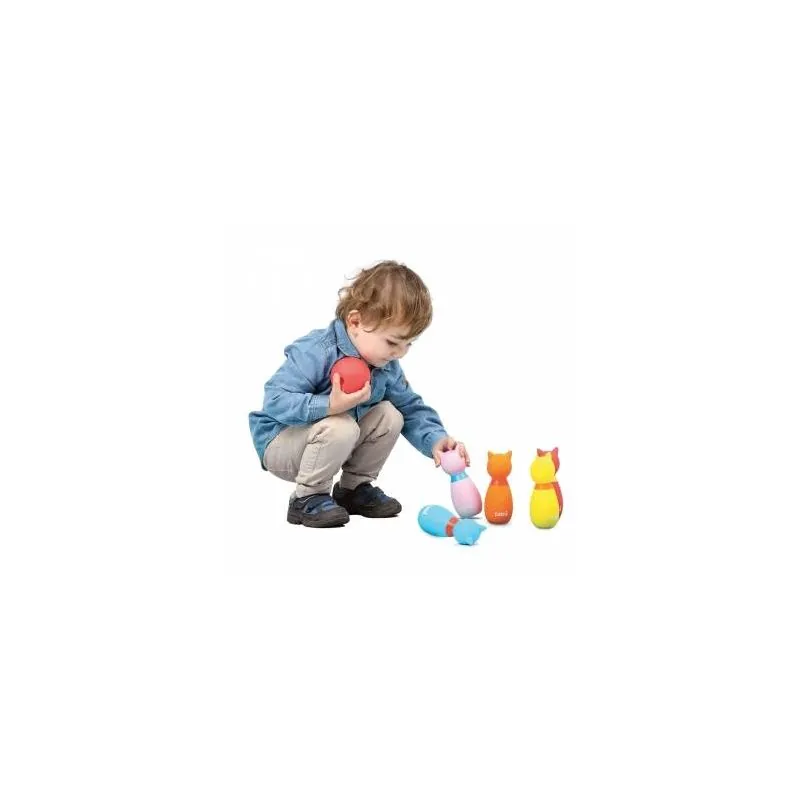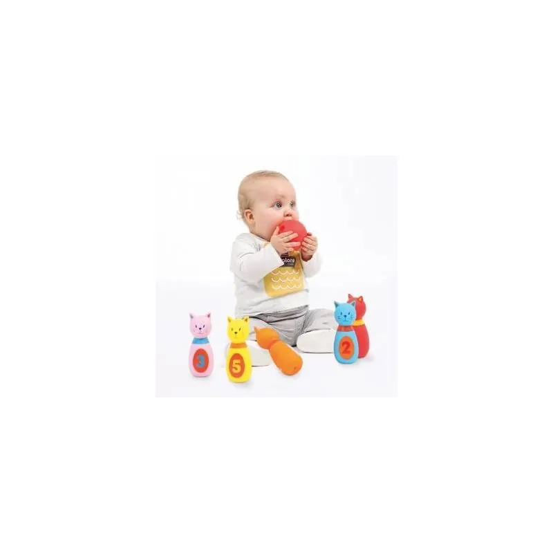 Attīstiet mazuļa motoriku, spēlējot boulingu!Komplektā 5 ķegļi un 1 bumba.Ķegļi izgatavoti no mīkstas plastmasas.Ieteicams bērniem no 10 mēnešiem.Ķegļa izmēri: 6 x 6 x 15 cm.Var mazgāt ar ūdeni un ziepēm.Rotaļlieta marķēta ar CE zīmi.