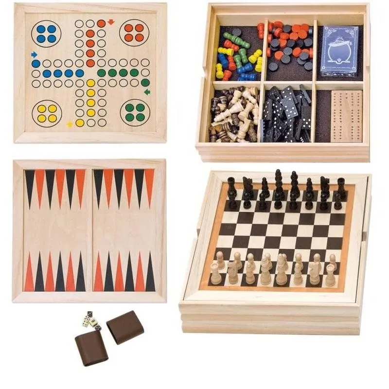 Visu laiku populārākās galda spēles, lielā koka kastē. Komplektā 6 spēles. Dambrete, šahs, bekgemons, kārtis, domino.Kastes izmērs: 27 x 27 cm.Piemērots lietošanai no 3 gadu vecuma.