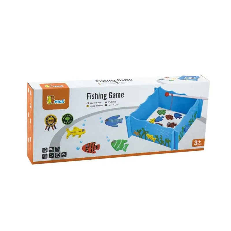 Komplektā ietilpst: 4 magnētiskās makšķeres, 20 krāsainas magnētiskās zivis, koka kastīte - ezera imitācija;