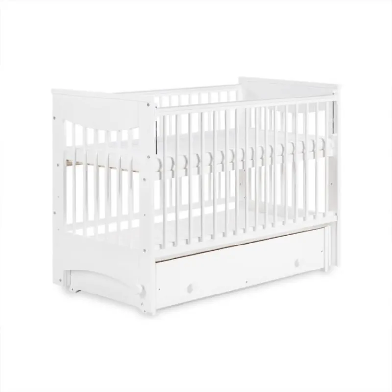 Iekšējie izmēri: 120x60 cm;Krāsa balta, netoksiskas krāsas;Jauna šūpoļu tehnoloģija ar bloķēšanas funkciju;Iebūvēts slēgts atvilktne priekšmetiem;Izgatavots no priedes masīva un plātnes;Trīs augstumu regulējams dibens;Plastmasas aizsargi uz gultiņas malām - margas;Nolaižama sāna;Kociņi neizņemami;