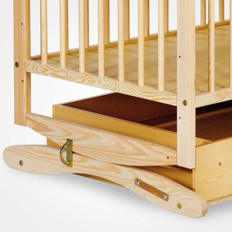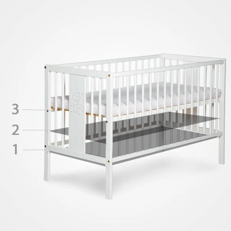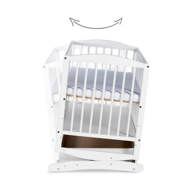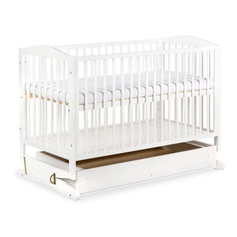 Koka gultiņa mazulim;Baltā krāsā;Izgatavota no dabīga koka, priedes masīva;Zem gultas ir slēgts atvilktne priekšmetu glabāšanai;Atvilktne izgatavota no MDF un mēbeļu plātnes;Ar izņemamiem stieņiem;Trīs pozīcijās regulējams dibens;Integrētas šūpoles ar atsperēm, kuras var fiksēt, lai gulta nešūpotos;Matraču gultiņai varat izvēlēties ŠEITIzmēri: 120x60cm.