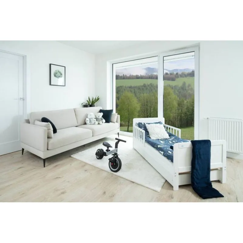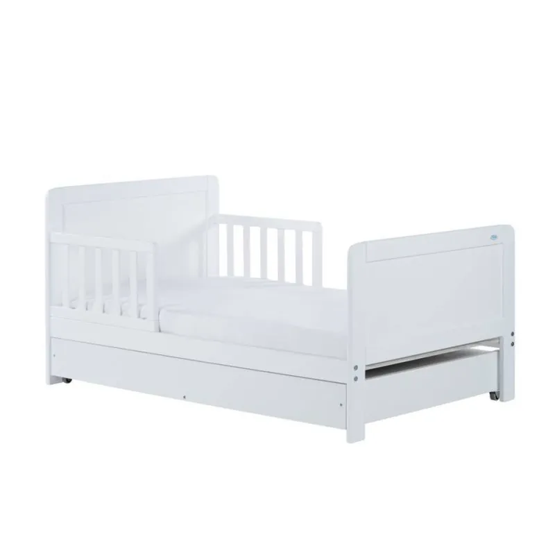 Priežu masīvkoka gultiņa, Apakša laminēta kokskaidu plātne,Plakani stieņi 32 mm biezumā ar 5,5 cm atstarpēm,Atvilktne no kokskaidu plātnes, uzstādīta uz rullīšu vadotnēm, un vāks no HDF plātnes Iekšējie izmēri 140x70 cm.