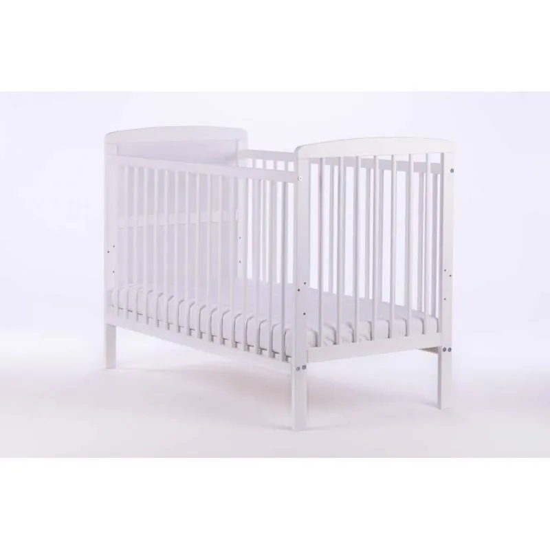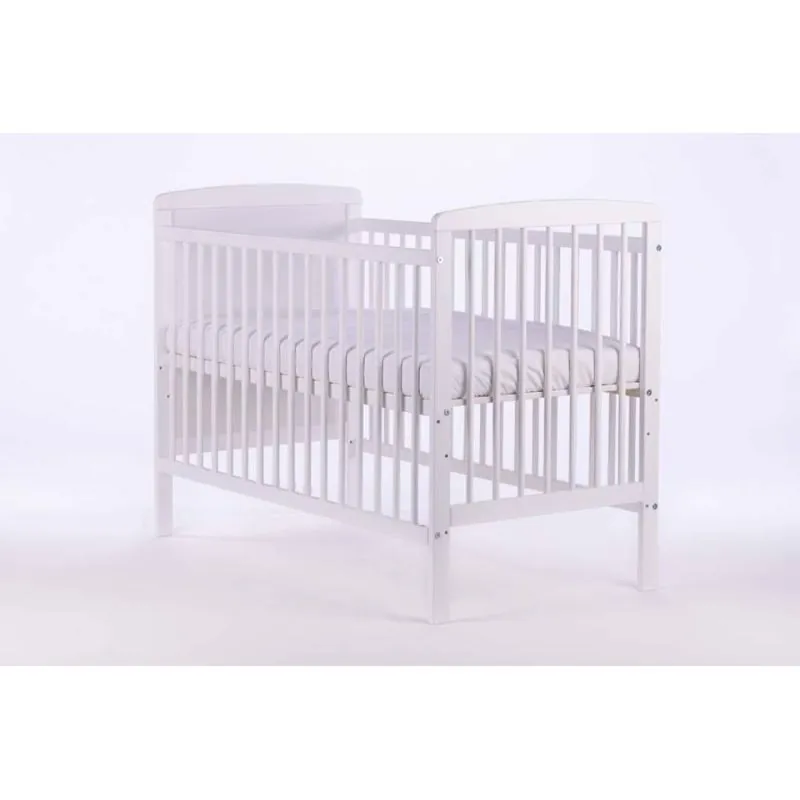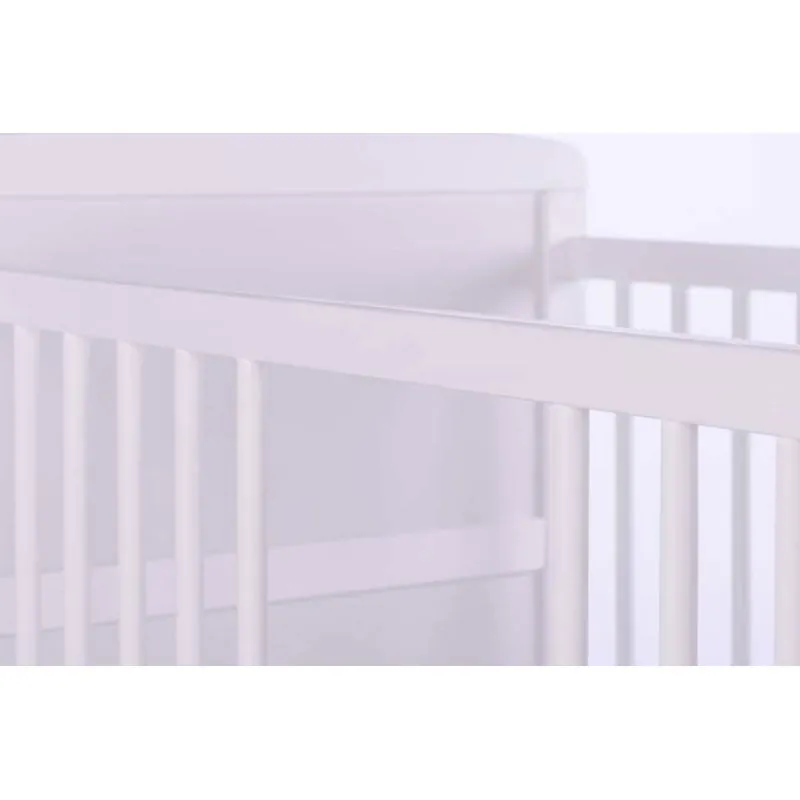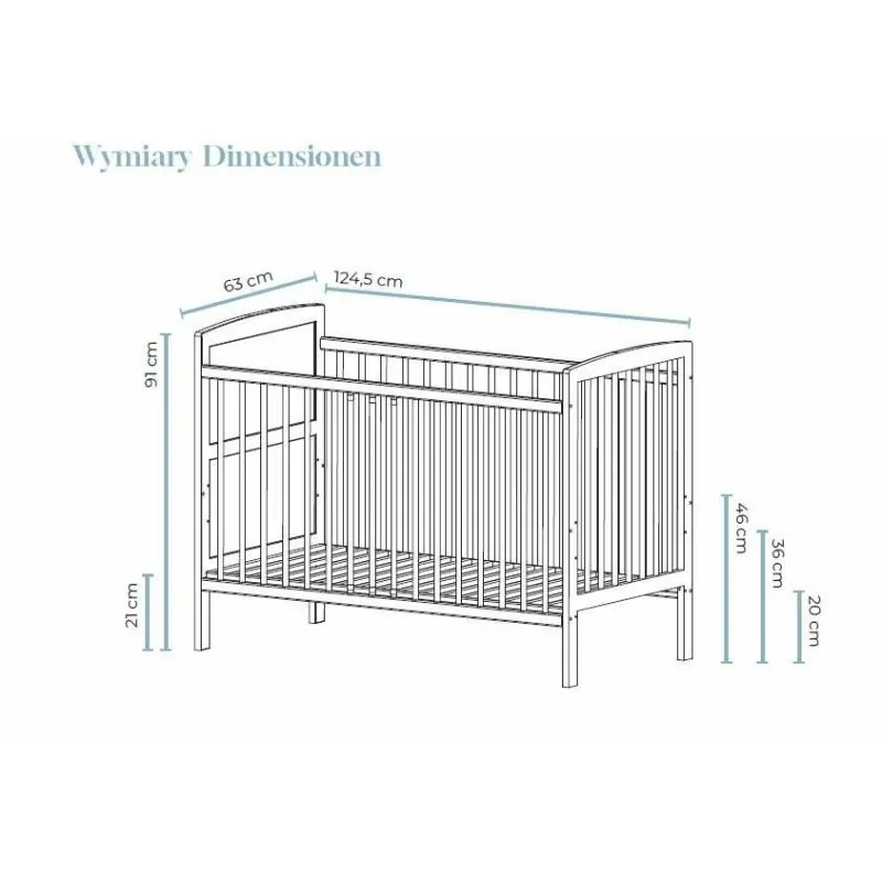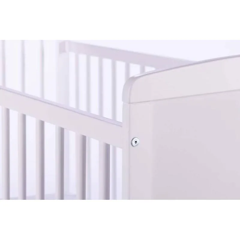 Priežu masīvkoka gultiņa;Kokskaidu plātnes priekšpuse;Apaļi 16 mm diametra stieņi, 5,5 cm attālumā viens no otra. Stieņi nodrošinās bērna drošību;Regulējams pamatnes augstums (3 pozīcijas);Noņemama sānu daļa.Izņemami stieņi, lai bērns, kad paaugsies, varētu pats iekāpt/izkāpt no gultiņas;Matraču gultiņai varat izvēlēties ŠEIT