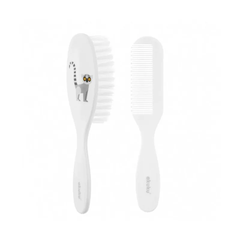 Šis komplekts ļauj vecākiem daudz vieglāk rūpēties par mazuļa higiēnu, un arī pati darbība ir patīkama bērnam!Birstei ir mīksti sariņi, kas piemēroti maigu mazuļa matu un galvas ādas kopšanai. Nekairina galvas ādu, un ērtā neslīdošā roktura dēļ to ir viegli lietot pat peldoties.Ķemme ar noapaļotiem galiem pasargā no galvas ādas kairinājuma.Zobi beidzas ar lodītēm, kas pasargā no nepatīkama pieskāriena.Ķemmei ir arī neslīdoši rokturi, lai to būtu ērti lietot ne tikai vecākiem, bet arī pašam bērnam, kurš vēlas patstāvīgi rūpēties par matiem.Gan ķemme, gan birste neelektrizē matus.Regulāra bērna galvas ādas masāža ar birsti stiprina matus un paātrina to augšanu.