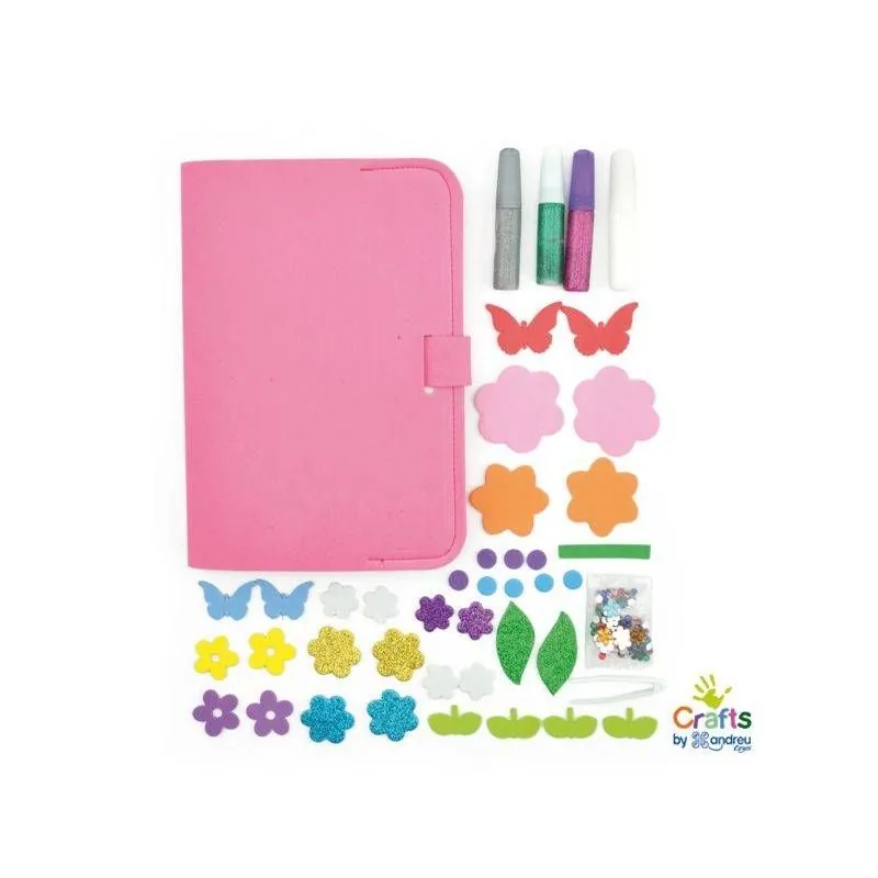 Komplekts, kurā atradīsiet visus instrumentus, kas nepieciešami piezīmju grāmatiņas izgatavošanai. Piezīmju grāmatiņa, kuru dekorēsiet, dažādas uzlīmes, spīdumi.