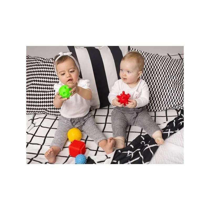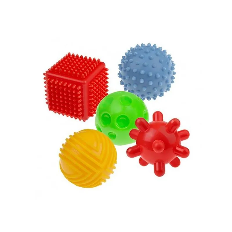 Izmantoti dažādi materiālu faktūras, kas nodrošina taustes sajūtas, kas attīsta plaukstas un pirkstu kustību precizitāti;Stimulē sajūtu receptorus;Attīsta satveršanas prasmes;Stimulē redzes sajūtas;Ir neaizvietojami rāpošanas posmā, mazulis var ripināt bumbiņas;Noder arī zobu šķilšanās laikā, jo bumbiņu faktūra masē smaganas.