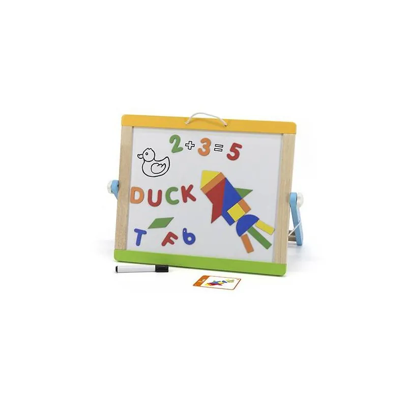 Komplektā esošā divpusējā tāfele sastāv no: 26 magnētiem ar burtiem, 10 cipariem, 29 magnētiem ar ģeometriskām figūrām, 10 kartītēm ar instrukcijām, krīta komplekts, sūklis tāfeles tīrīšanai, marķieris, papīra rullis, maiss visiem piederumiem glabāšanai. Tāfeli ir viegli salikt, tāpēc to ir viegli uzglabāt un transportēt. Vienā pusē ir krīta tāfele, otrā - magnētiskā tāfele (ar marķiera rakstīšanas funkciju). Tāfelē ir rullis ar papīru, ko var uzlikt uz tāfeles un brīvi zīmēt. Magnētu krāsas un formas ļaus radoši spēlēties.Tāfele veicinās mazā bērna iztēli.