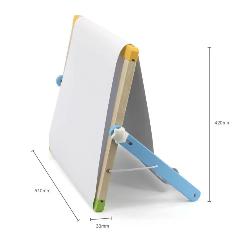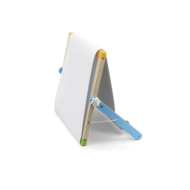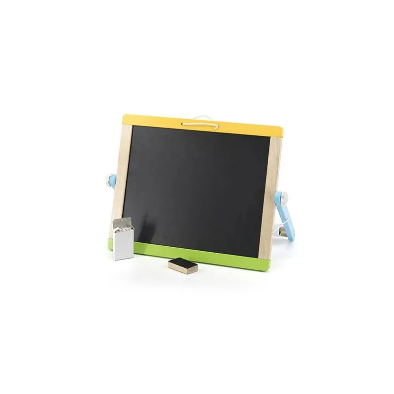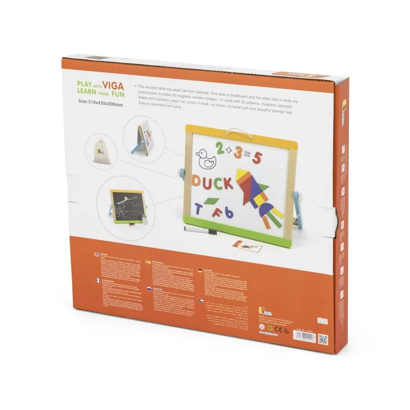 Komplektā ir vairāk nekā 80 gab. piederumu.Vienā pusē ir krīta tāfele, otrā - magnētiskā tāfele ar iespēju uz tās rakstīt ar marķieri.Papildu papīra rullis ļauj jums izveidot pastāvīgus zīmējumus.Tāfele izgatavota no augstas kvalitātes koka.Krāsota ar netoksiskām krāsām.Ja nav asu malu, tas ir droši bērnam.Tāfeli ir viegli salikt un nest.