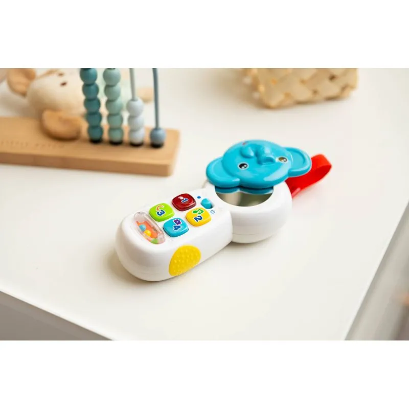 Mūzikas pogas – rada dažādas skaņasGrabulis ar bumbiņāmSpīdoša pogaAtverama mute ar paslēptu spoguliVelcro siksniņa - ļauj piekārt tālruni ratiņos vai šūpulī