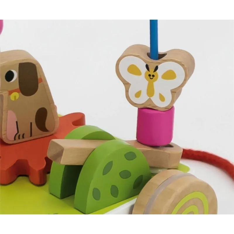 Vienas cilpas apakšā ir katapulta, kas var "izšaut" krelles.Rotaļlietas pamatne - pļava ar putnubiedēkli, suni un govi. Visi simboli tiek novietoti uz zobratiem, kurus var brīvi konfigurēt. Labirints ir ļoti interesanta nodarbe mazulim, un krāsainās izklaides noteikti piesaistīs viņu savā pasaulē.Labirints ir uz riteņiem, tāpēc bērns varēs to paņemt līdzi.Papildu priekšrocība riteņiem - neslīdoša gumija, kas ir uz koka riteņiem. Tās aizsargā grīdas no skrāpējumiem.Rotaļlieta māca bērnam loģisko domāšanu, pacietību un palīdz atšķirt pamatformas un krāsas. Spēles laikā attīstās roku prasmes, krāsu un formu uztvere.Visa lieta ir izgatavota no dižskābarža koka un krāsota ar netoksiskām krāsām spilgtās krāsās, kas piesaistīs uzmanību un veicinās spēlēšanos, vienlaikus sniedzot daudz prieka.Vigos prioritāte ir bērnu drošība un augstākā rotaļlietu kvalitāte, tāpēc rūpējas, lai krāsas, ar kurām tiek krāsotas rotaļlietas, nebūtu toksiskas un atbilstu drošības standartiem (EN71 un ASTM).Rotaļlieta paredzēta bērniem no 18 mēnešu vecuma.Izstrādājuma izmēri:200mm x 240mm x 195mmSvars 0,88 kg