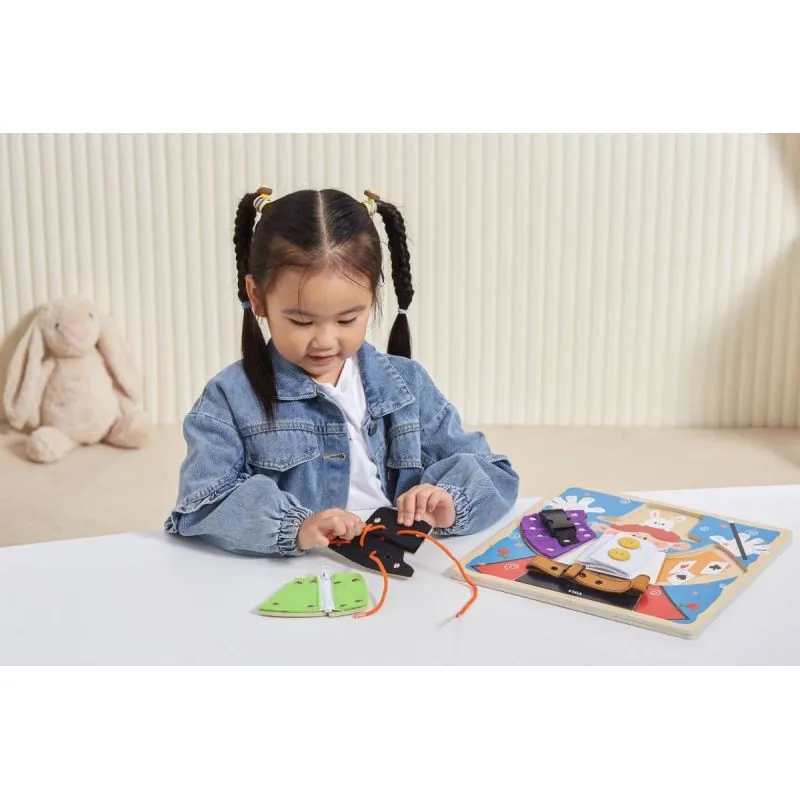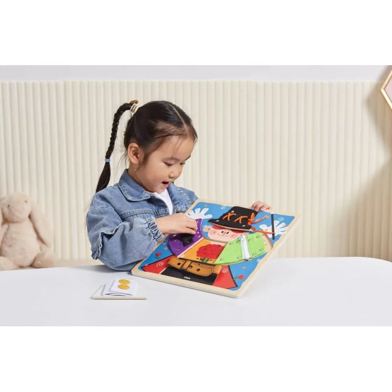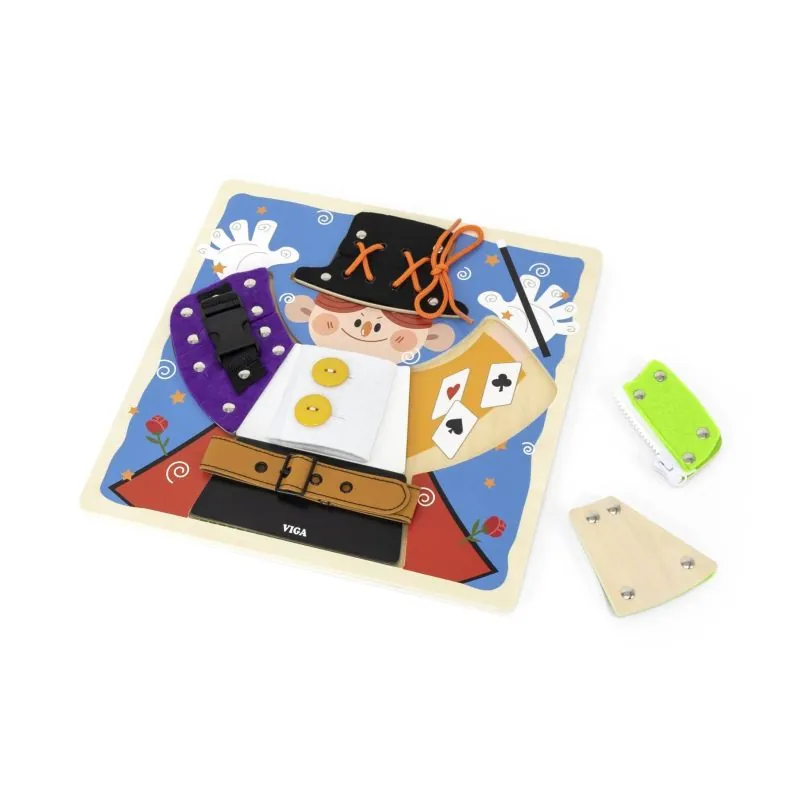 Palīdz attīstīt ģērbšanās prasmes ar pogām, rāvējslēdzēju, sprādzi, auklām un jostu. Katrs stiprinājuma elements ir piestiprināts pie viena koka elementa, kas novietots uz dēļa ar profilētām atverēm. Bērni var noņemt daļas un atrast zem tās paslēptu attēlu.Rotaļlieta palīdz attīstīt motoriku un māca pamata ģērbšanās prasmes. Tā veicina iztēles attīstību un palīdz attīstīt spēju savienot elementus vienotā veselumā.Tas viss ir izgatavots no dižskābarža koka un krāsots ar netoksiskām krāsām, kas piesaistīs uzmanību un veicinās jautrību, vienlaikus sniedzot daudz prieka. Krāsas ir 100% drošas, atbilst EN71 un ASTM drošības standartiem.Puzles ir iepakotas krāsainā kartona kastē, lieliski piemērotas dāvanai.Rotaļlieta ir paredzēta bērniem no 18 mēnešu vecuma.Visa VIGA rotaļlietu sērija ir izstrādāta, lai apmierinātu vecāku un bērnu cerības, uzlabojot viņu attīstības procesu spēlējoties.Garums: 300 mm x A: 25 mm x P: 300 mm
