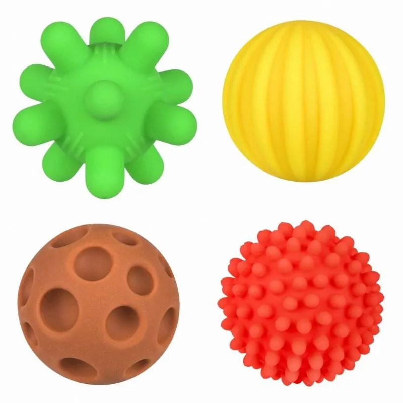 Četru mīkstu sensoru bumbiņu komplekts, paredzēts sensorajiem vingrinājumiem un spēlēm;