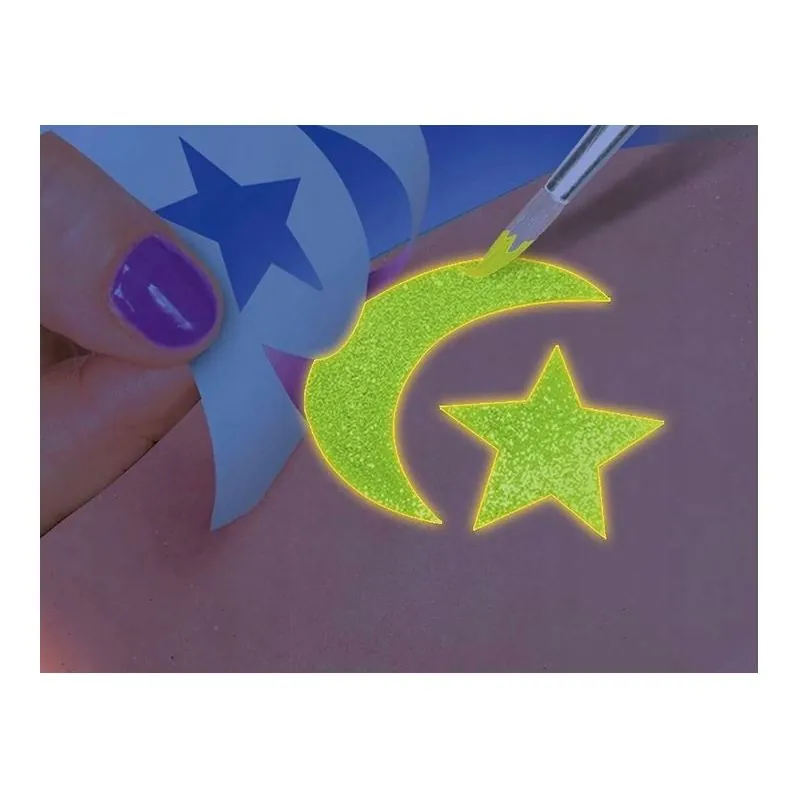 Komplektā ietilpst lipīgi trafareti, krāsaini spīdumi un ķermeņa krāsas ar "Glow in the Dark" efektu;