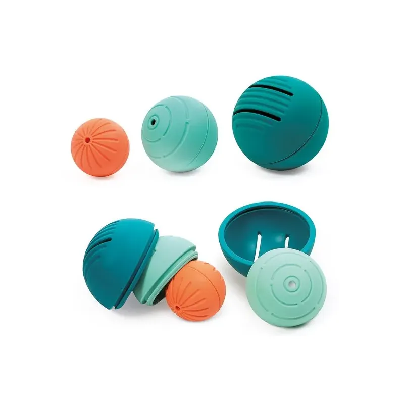 Trīs mīkstas bumbiņas, kuras var ievietot viena otrā;