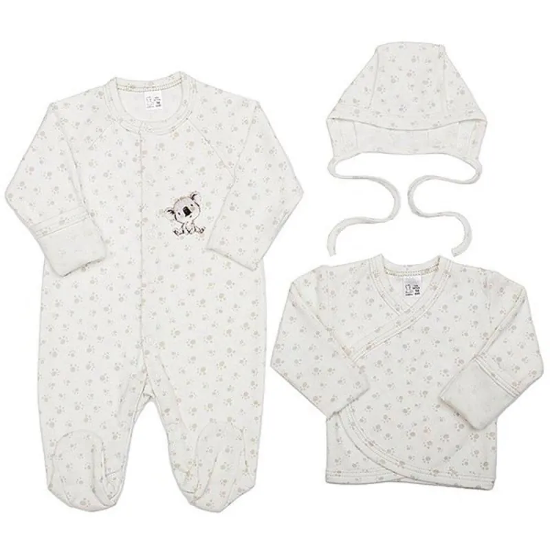 Mīksts kokvilnas 3 daļu komplekts zīdaiņiem un jaundzimušajiem.Komplektā ietilpst:Kombinezons, ietinamais krekls, cepurīte.Izgatavots no OEKOTEX sertificētas un mīkstas 100% kokvilnas.Krāsa: balta.Mazgāt automātiskajā veļas mašīnā 40 grādu temperatūrā.Izgatavots Lietuvā.Komplekts iepakots kastē.Lieliski piemērots dāvanai.