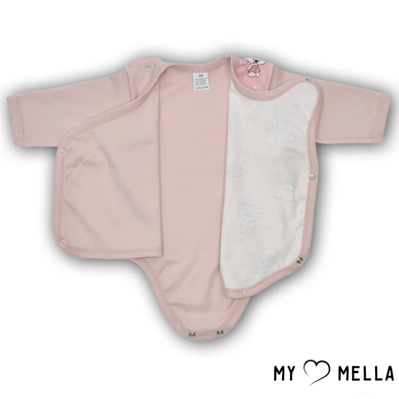 Kombinezons ar garām piedurknēm, ietinamais bodijs ar garām piedurknēm, bikses ar pēdiņām, cepurīte, cimdiņi.