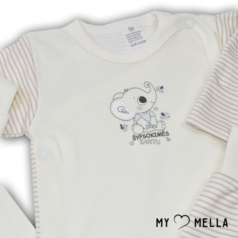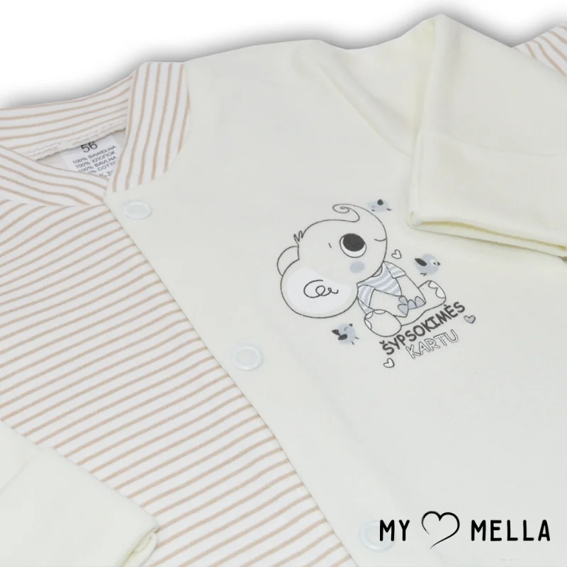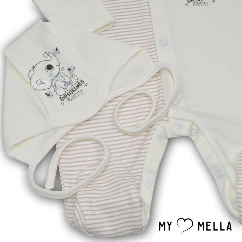 Kombinezons ar garām piedurknēm un atlokāmām cimdiņām, bodijs ar garām piedurknēm un atlokāmām cimdiņām, bikses ar pēdiņām, cepurīte.