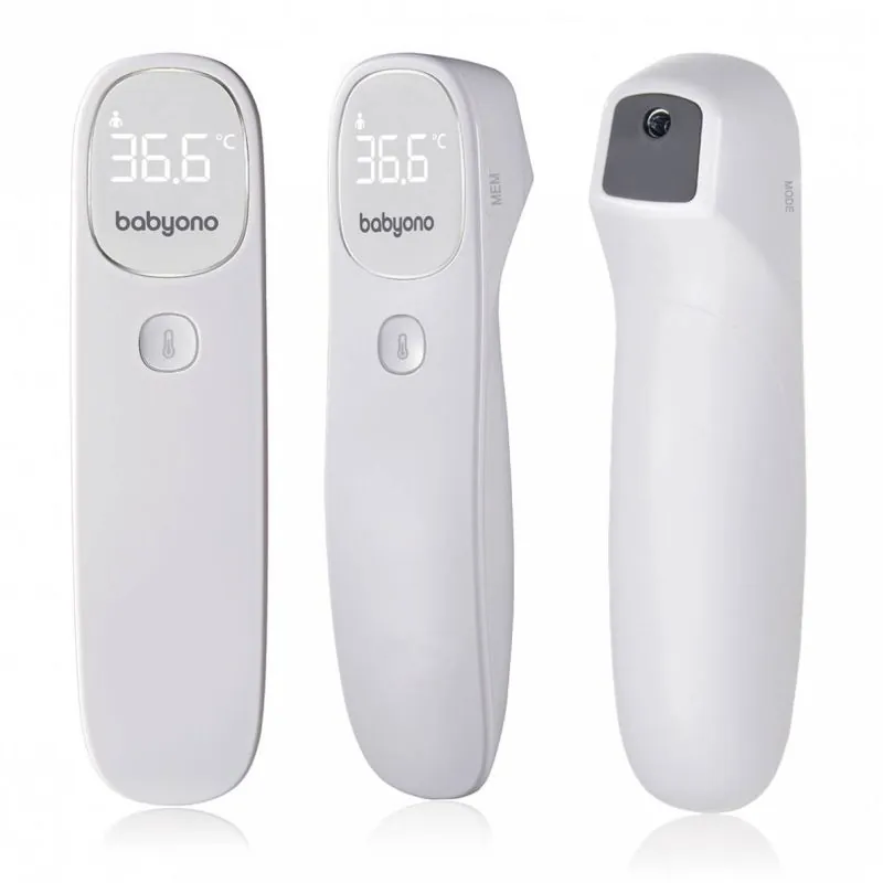„Babyono“ bezkontakta termometrs.Virzot termometru tieši uz pieres, varat ātri un precīzi izmērīt temperatūru. Viegli un ērti lietojams, salīdzinot ar tradicionālajiem mutes, paduses vai ausu termometriem.Ar vienu pogas spiedienu varat iegūt precīzu informāciju 1 sekundes laikā.Termometrs arī mēra priekšmetu, pārtikas, šķidrumu un apkārtējās vides temperatūru.Kluss skaņa un unikāla vibrācija ļauj izmērīt temperatūru mazulim, kamēr viņš guļ. Stilīgs un apgaismots LED ekrāns ļauj viegli izmērīt temperatūru pat naktī.Termometrs cilvēka ķermeņa temperatūras mērīšanai 0–3cm attālumā no pieresPapildu virsmas un apkārtējās vides temperatūras mērīšanas režīmiUzticama un stabila temperatūras mērīšana, pateicoties uzlabotai infrasarkanās staru noteikšanas sistēmaiVibrācijas trauksme, kad temperatūra ir augstāka par 38°CPēdējo 32 rezultātu atmiņaBalts LED ekrānsTemperatūras mērījumu rezultātu attēlošana Celsija un Fārenheita grādosAutomātiska izslēgšanās (<30 sekundes) enerģijas taupīšanaiPraktisks un vienkāršs lietošanā