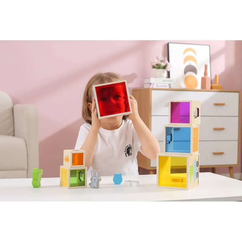 Lieliski piemērots bērnam no 12 mēnešiem. Tas sastāv no 6 dažāda izmēra koka klucīšiem, kurus var sakārtot piramīdā vai salikt vienu otrā. Katra siena ir ar atšķirīgu tematiku: krāsaini cipari, dzīvnieku nospiedumi, šķirošanas izgriezumi ar atbilstošām dzīvnieku formas klucīšiem, viena siena – no caurspīdīga krāsaina plastmasas. Šī universālā rotaļlieta veicina loģisko domāšanu, koncentrāciju, koordināciju un smalko motoriku.Pateicoties tai, bērni mācās atpazīt dzīvnieku formas, krāsas, ciparus, daudzumus, veidus. Tas lieliski atbalsta iztēles attīstību.Visi priekšmeti ir izgatavoti no dižskābarža koka un krāsoti ar netoksiskām krāsām, kas piesaistīs uzmanību un veicinās spēlēšanos, vienlaikus sniedzot daudz prieka. Krāsas ir 100% drošas, atbilst EN71 un ASTM drošības standartiem.Rotaļlieta ir iepakota krāsainā iepakojumā. Pateicoties estētiskajam iepakojumam, rotaļlieta ir lieliski piemērota dāvanai.Rotaļlieta paredzēta bērniem no 12 mēnešu vecuma.Visa VIGA rotaļlietu sērija ir izstrādāta, lai apmierinātu vecāku un bērnu cerības, uzlabojot viņu attīstības procesu spēlējoties.