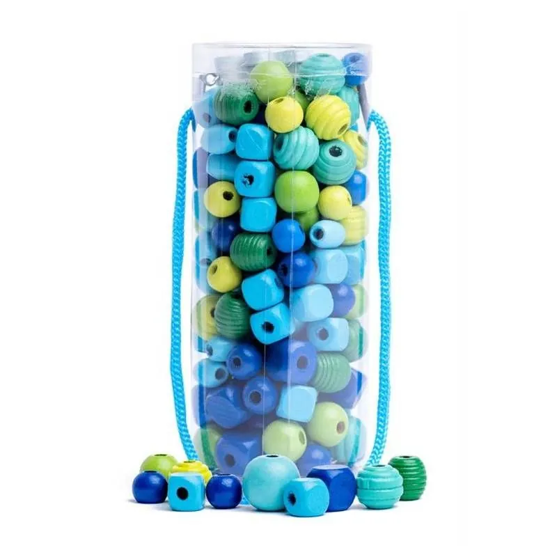Komplektā ir dažādu krāsu un formu koka pērlītes, kas paredzētas rokassprādžu vai citu rotaslietu veidošanai.