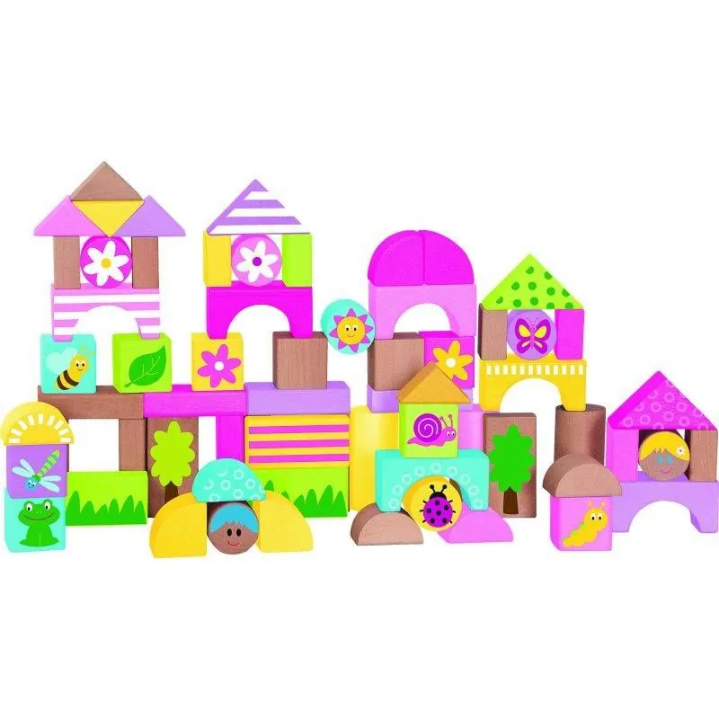 Maigi, pasteļtoņu krāsās dekorēti klucīši kastītē. Klucīšos attēloti ziedi, tauriņi, pļavas kukaiņi.