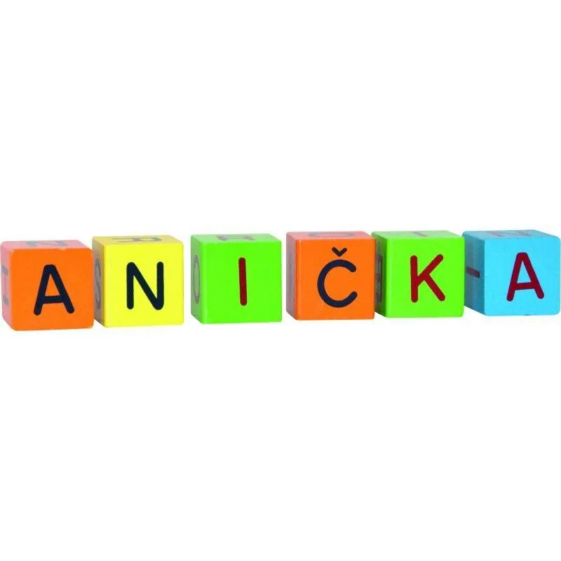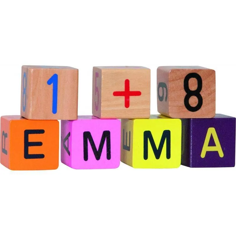 Koka klucīšu komplekts. Klucīši dekorēti ar burtiem un cipariem, no kuriem var izveidot vienkāršus pamata vārdus, mācīties burtus un ciparus.